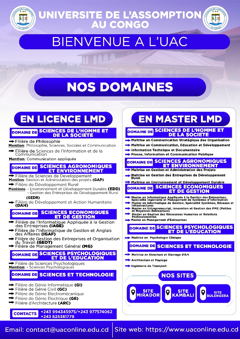 L’Université de l’Assomption au Congo a la joie de rassurer que les inscriptions vont bon train au site Kambali pour l’ouverture de l’année académique 2025-2026. Ainsi, elle invite tous les anciens et nouveaux diplômés d’Etat à l’inscription, et les anciens bacheliers à la réinscription en vue de confirmer leur place à l’UAC.